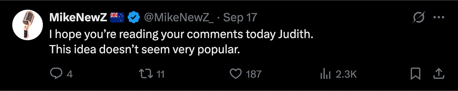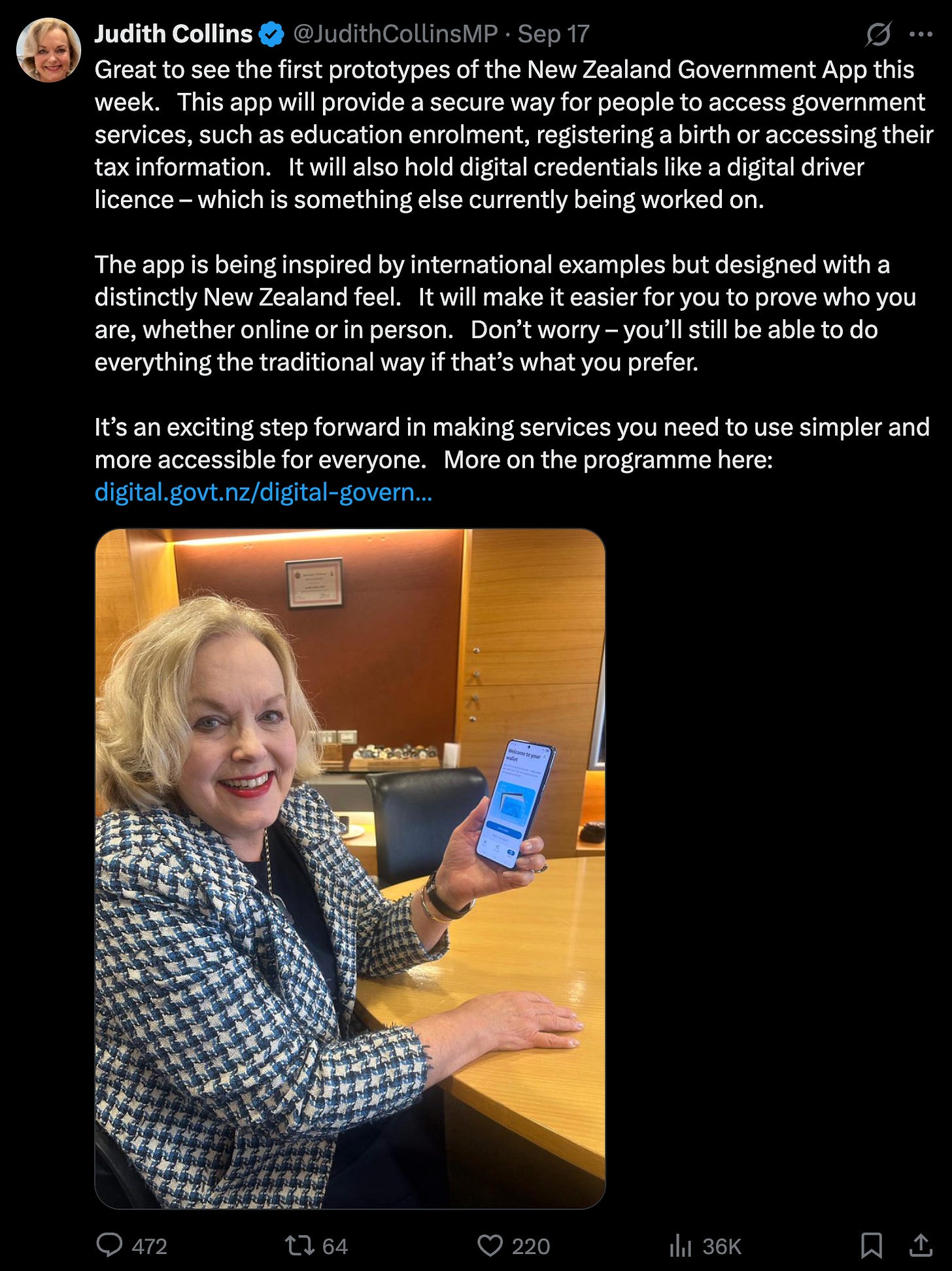 Judith Collins quickly got ratioed on X after announcing an update on Digital ID, demonstrating the first prototype of the New Zealand Government App.
