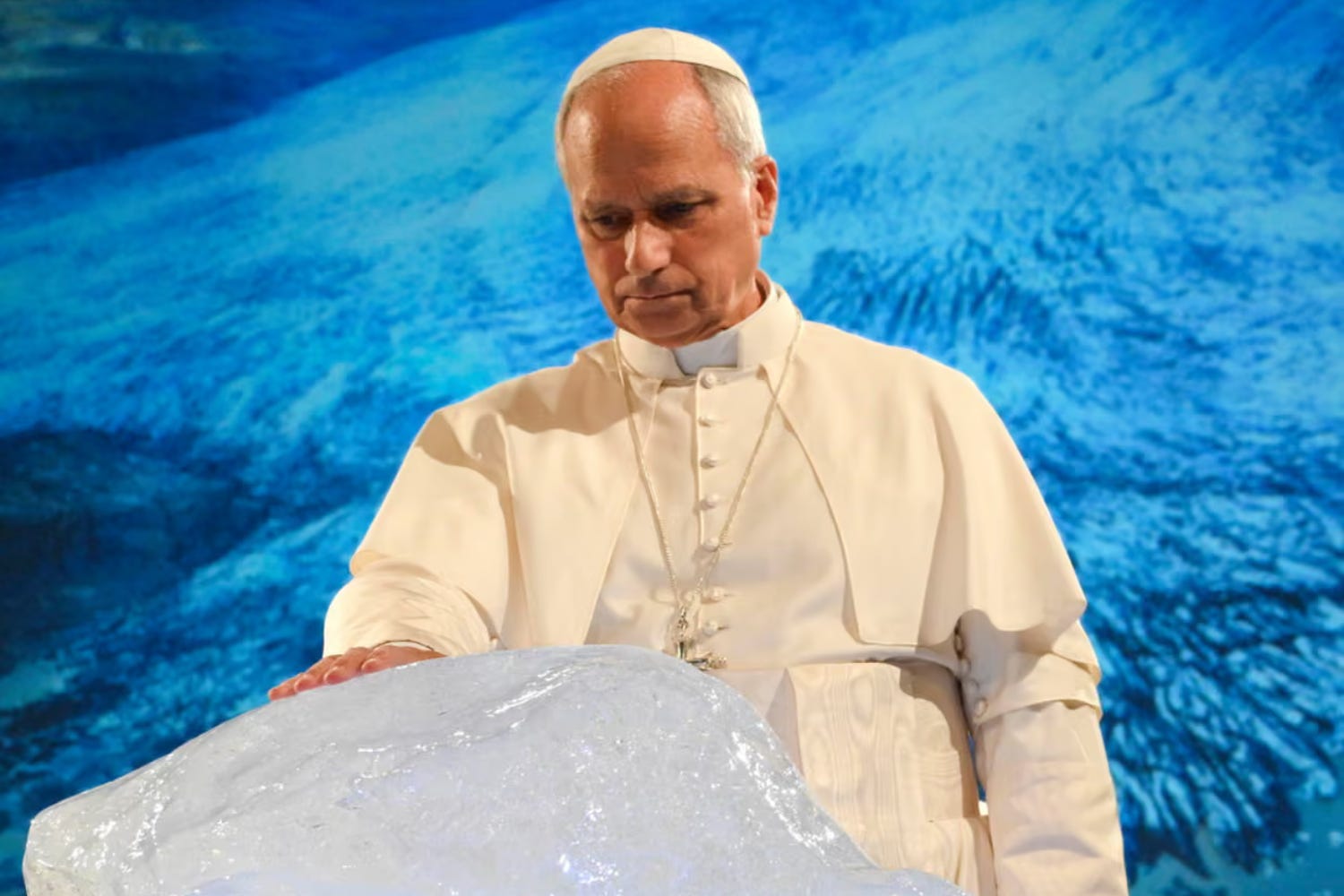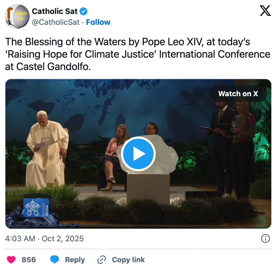 Pope Leo participated in a climate change summit at the Castel Gandolfo, blessing a chunk of melting ice.