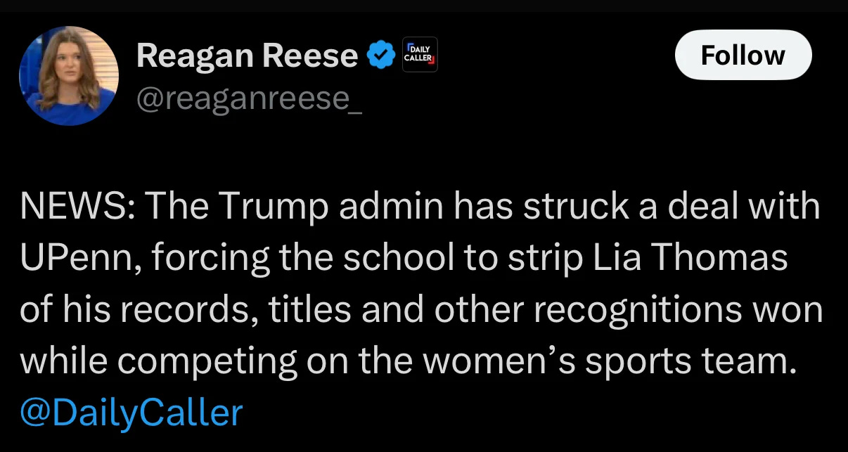 UPenn has been found to be in violation of Title IX by the DOE’s Office for Civil Rights for allowing men to compete against women.