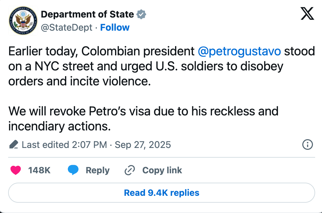 US revokes visa of Colombian president after he participated in a protest in New York urging soldiers to disobey Trump